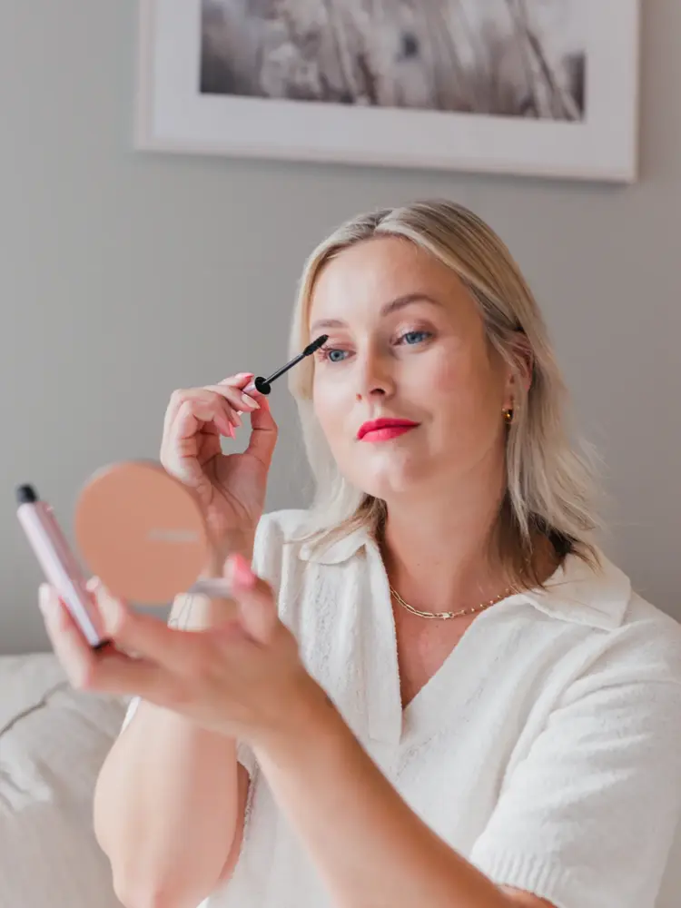 Dame som tar på seg mascara i speil