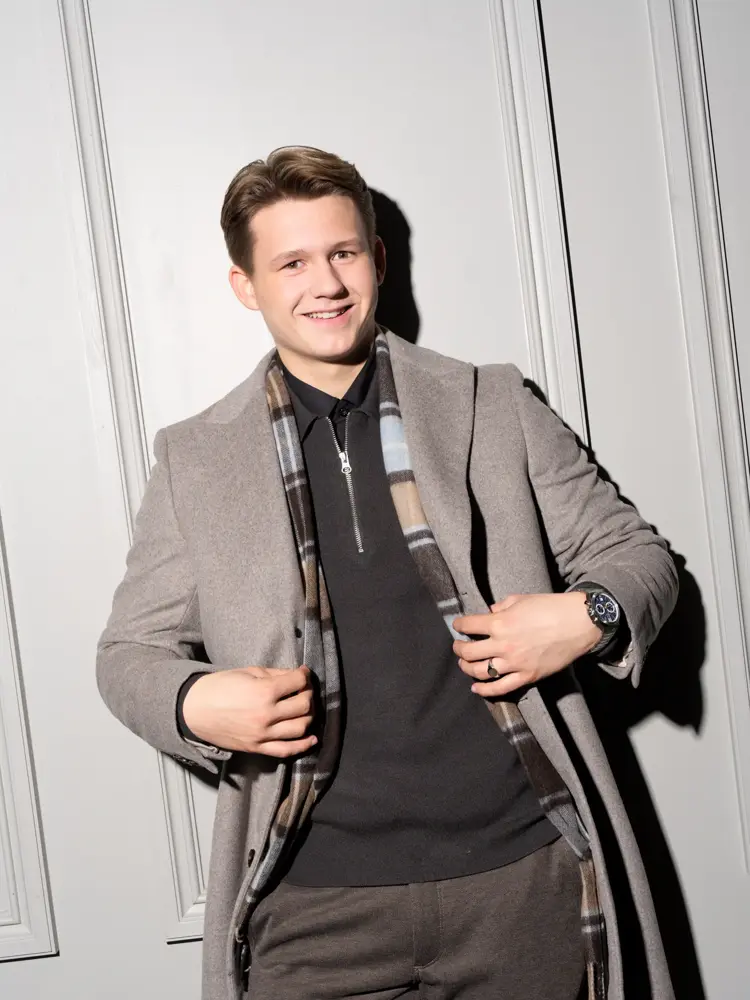 Skjerf fra Bertoni og frakk fra Dressmann. -