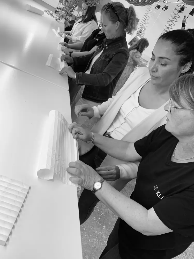 Den klassiske Le Klint-foldeteknikken er en del av deres DNA. Foldeteknikken føyer seg inn i rekken av danske håndverkstradisjoner, og er inspirert av den japanske brettekunsten origami. Ingen andre steder enn her har man bevart det å folde lampeskjermer som et håndverk. Den dag i dag lages skjermene for hånd i fabrikken i Odense. Her jobber det over 50 mennesker, hvorav mange bærer den stolte tittelen «foldemedarbeider» eller «foldepige». Flere av dem vært der i lang tid, som 52 år gamle Ulla. Hun har, i løpet av 25 år, rukket å brette imponerende 1,7 millioner lampeskjermer.