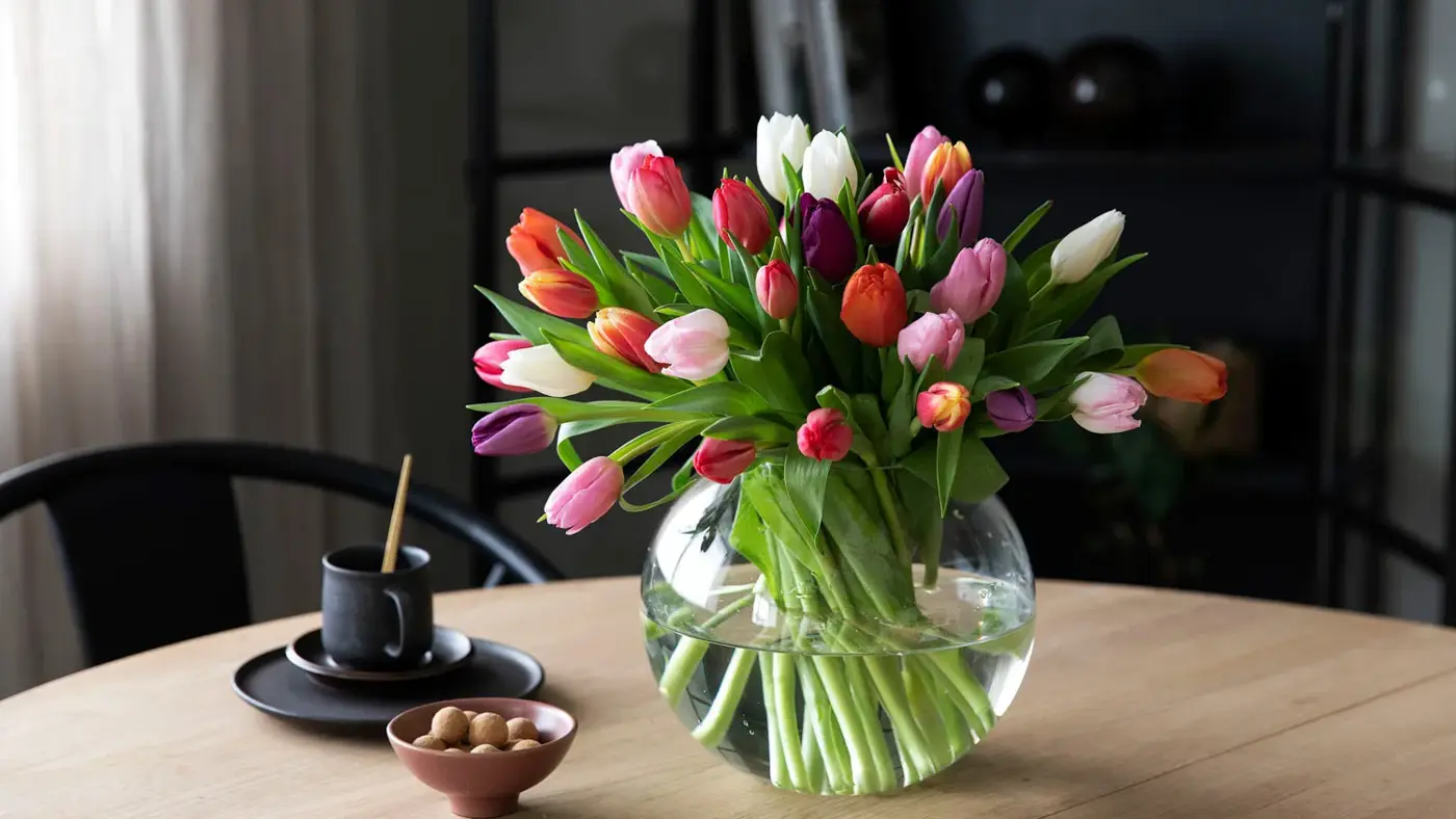Tulipaner er en av Norges mest populære snittblomster. Den har til og med fått sin egen dag, Tulipanens dag, som feires andre fredag i januar hvert år. Tulipaner kommer i mange vakre farger. Velg din favorittfarge, eller gå for en fargesprakende kombinasjon i varme eller kalde toner. Det er også lekkert å sette tulipaner sammen med sesongens grønt, voksblomster og vårlige grener.