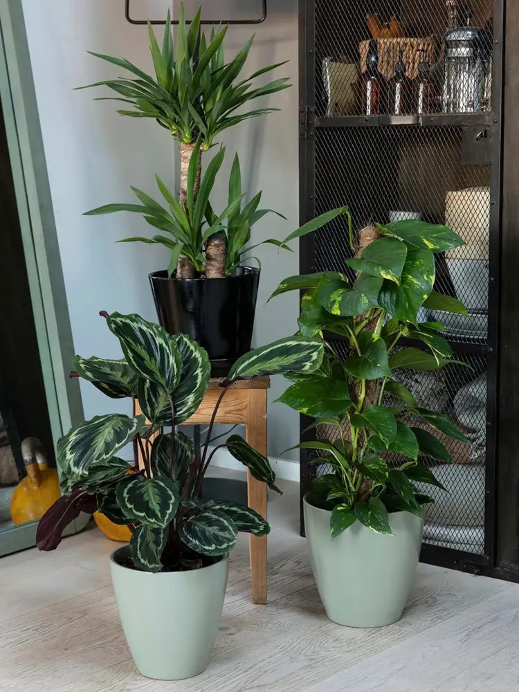 Skap en frodig oase med forskjellige planter med ulike bladmønster, farger og former. Kontrastene vil gi en spennende og dekorativ effekt. De fleste grønne planter er veldig lettstelte og enkle å få til å trives i alle rom i huset.